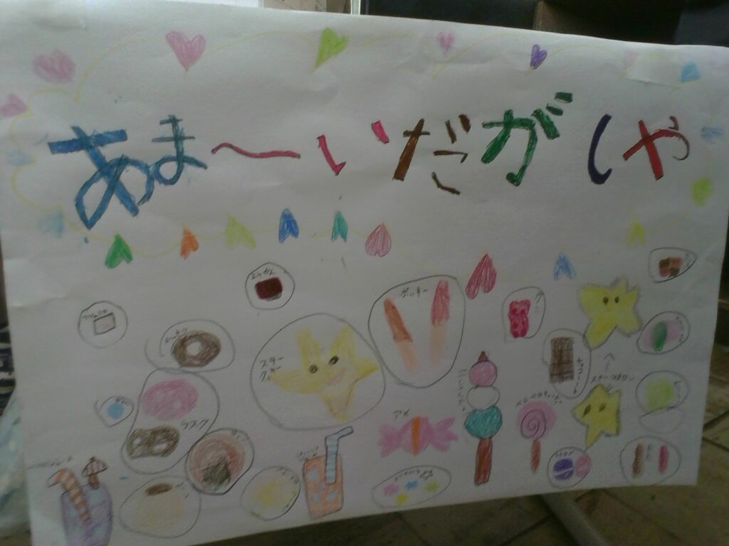 子どもたちは、画用紙にパンやえんぴつ、おもちゃなどを描き、楽しそうに商品を並べていました。
