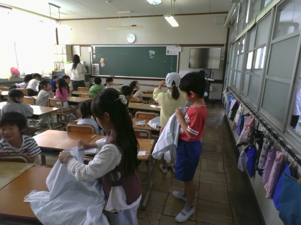 エプロン・ぼうし・マスクを身に着けて…