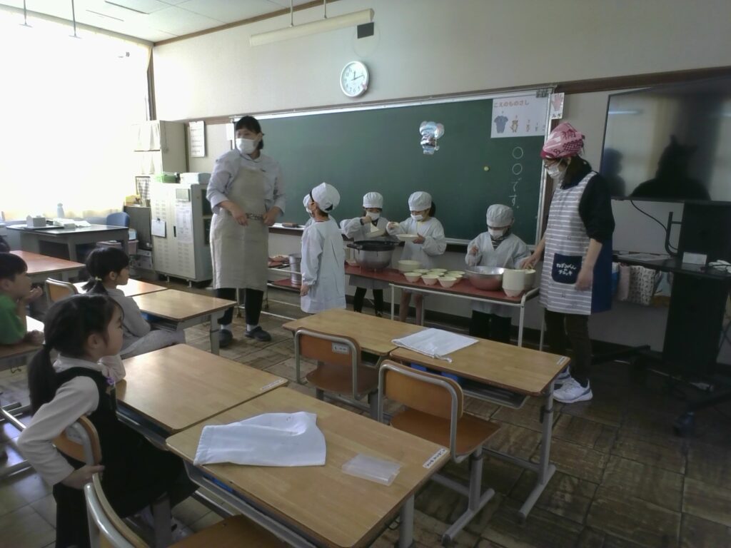 給食前の4時間目には、栄養の先生と一緒に食育の学習を行いました。