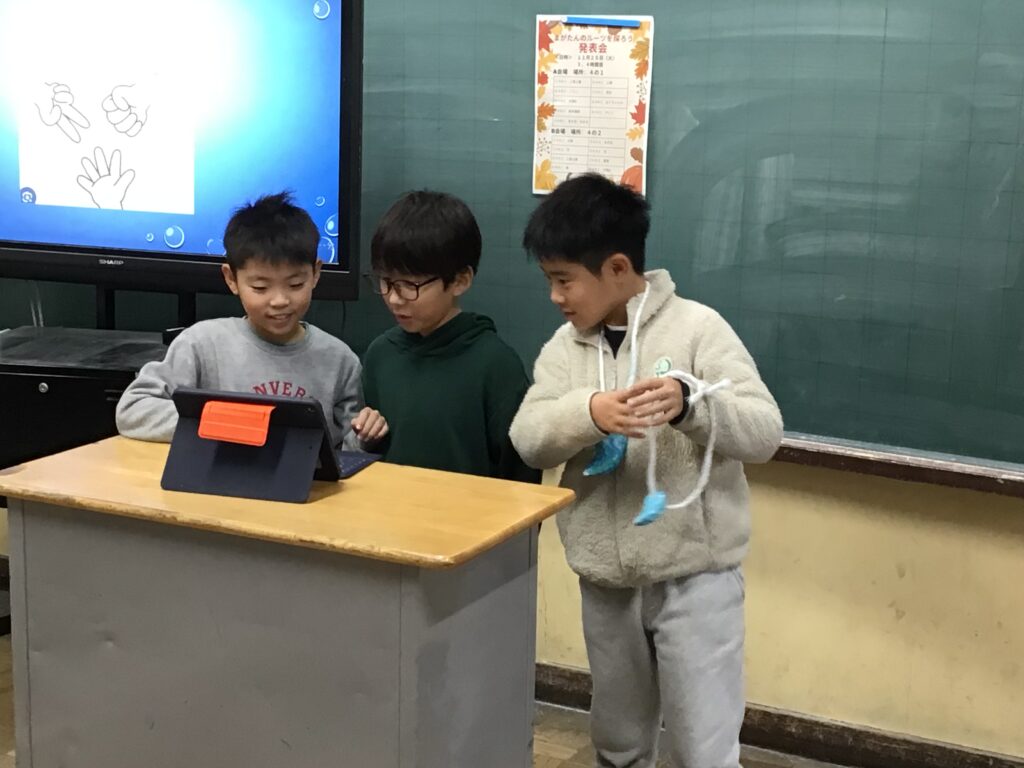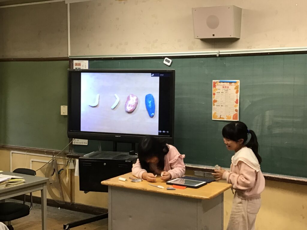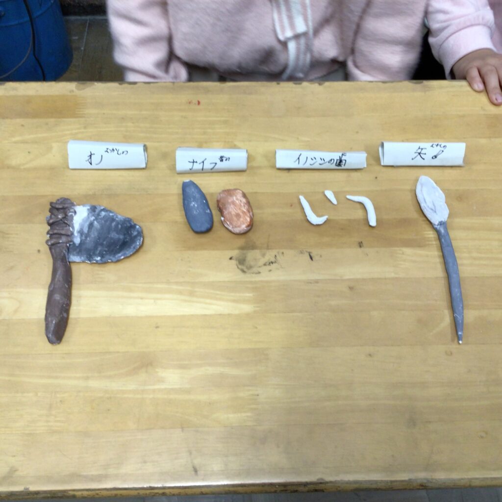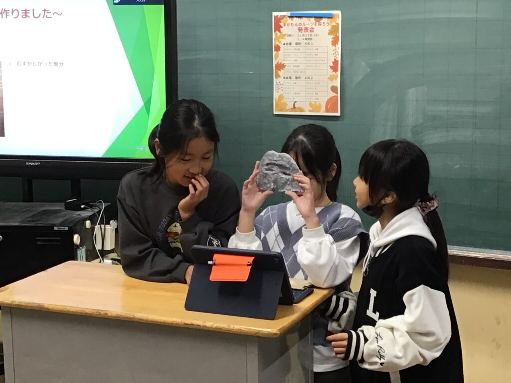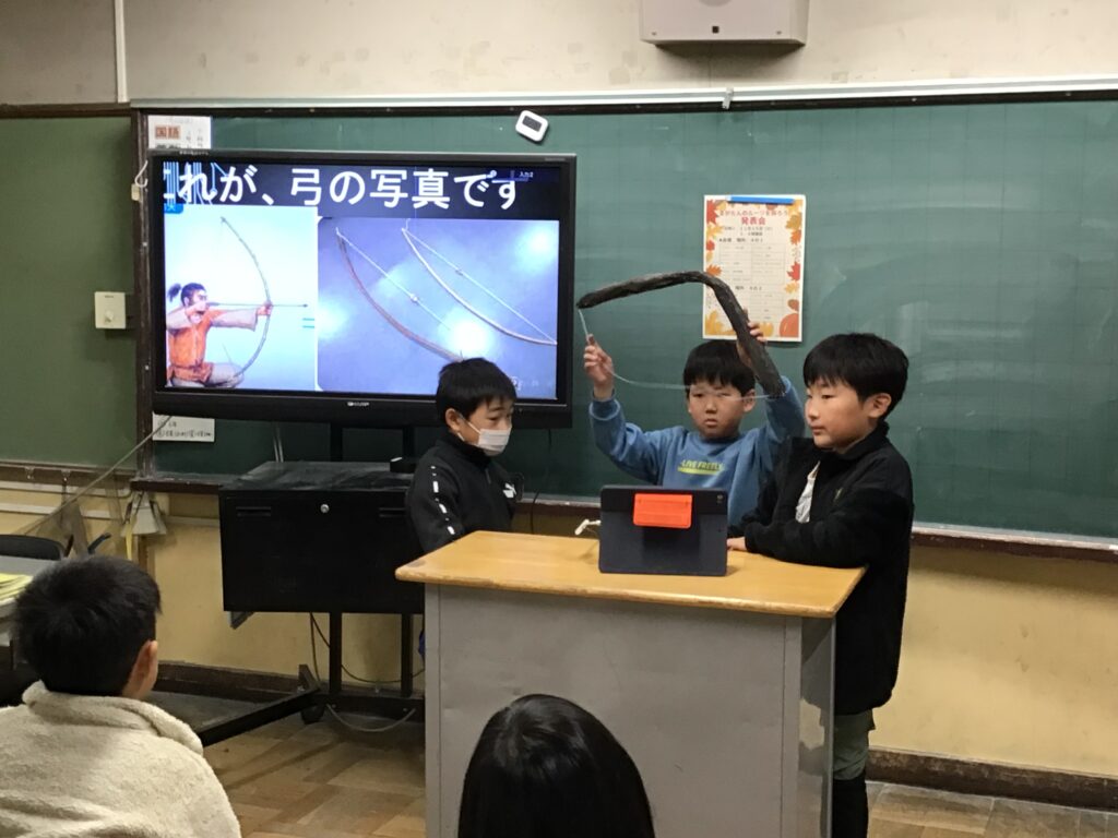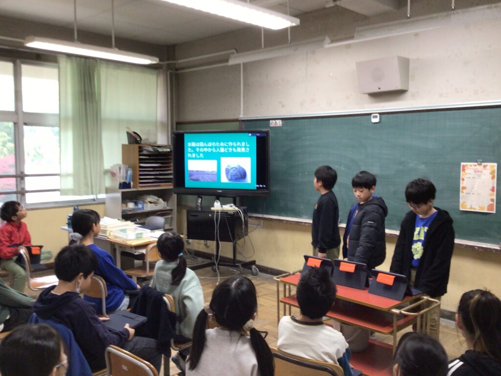 11月25日(月)4年生が総合的な学習の時間の取組として、本校敷地内に残る「森本遺跡」について各グループで調べたことを発表・交流する学習を行いました。弥生時代の人々のくらし(衣食住)や出土品(土器や勾玉・矢じり、丸木弓など)や稲作に使われた水路についてなど、各グループが調べたことや不思議に思ったことなどをしっかりとまとめて発表していました。中には、出土品の人面土器や勾玉、丸木弓の模型を工夫して作っているグループもありました。子どもたちは互いの発表を興味深く聞きながら、当時の人々の生活の様子をイメージしていました。