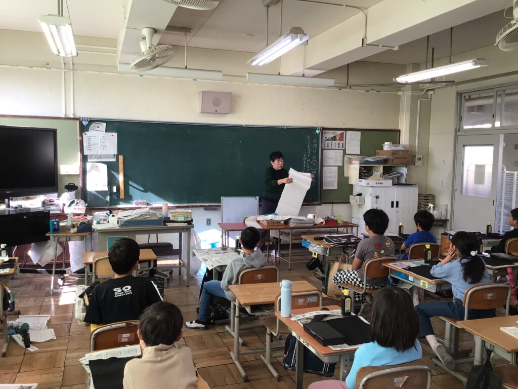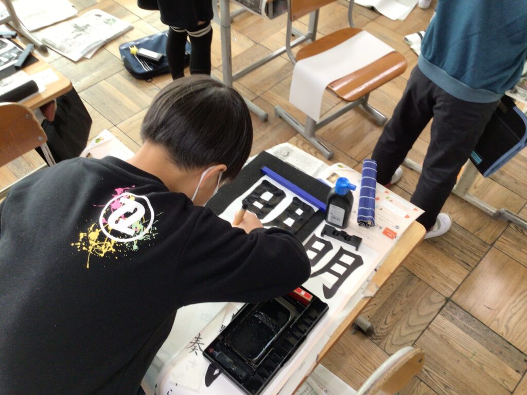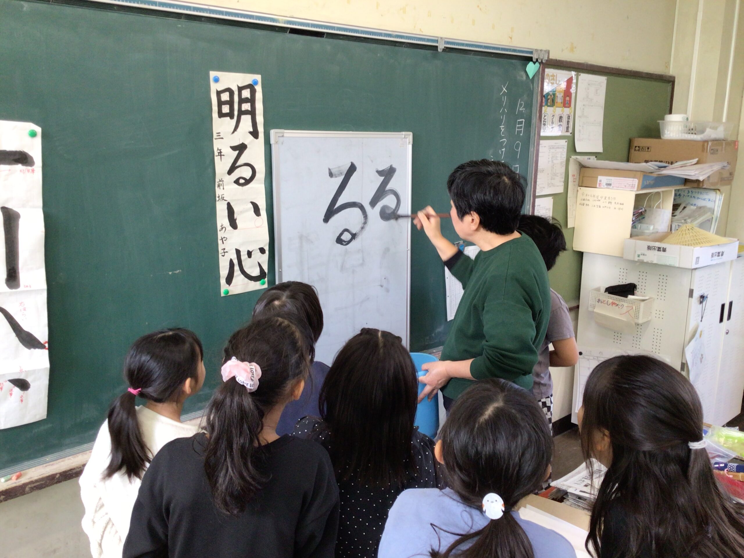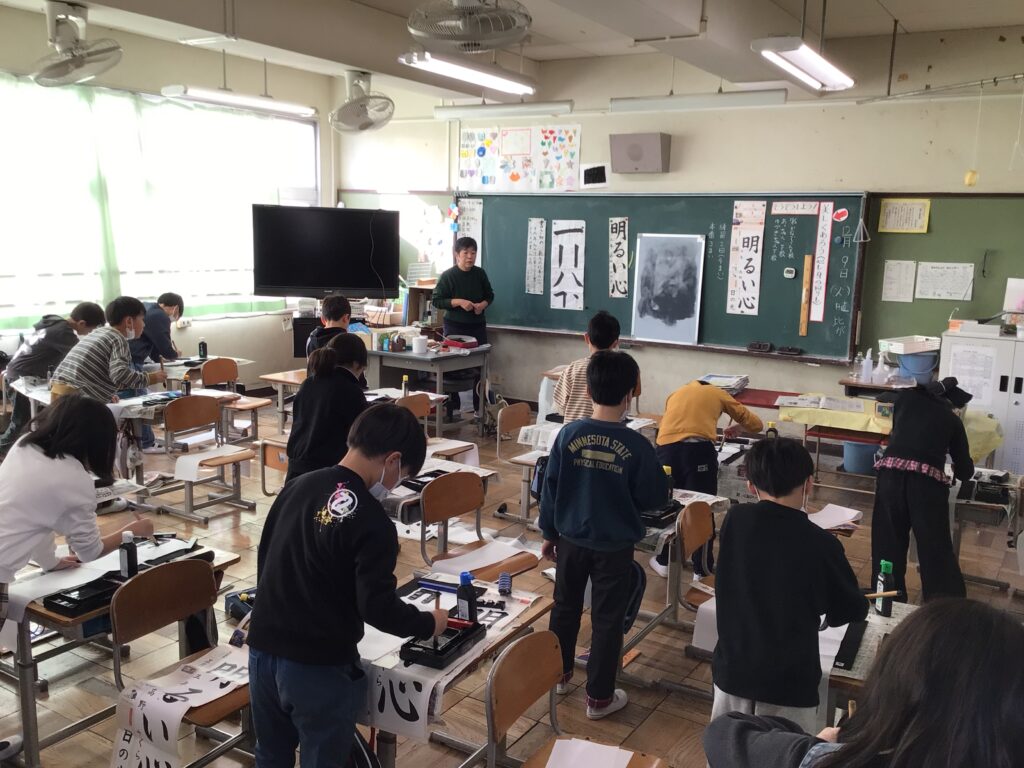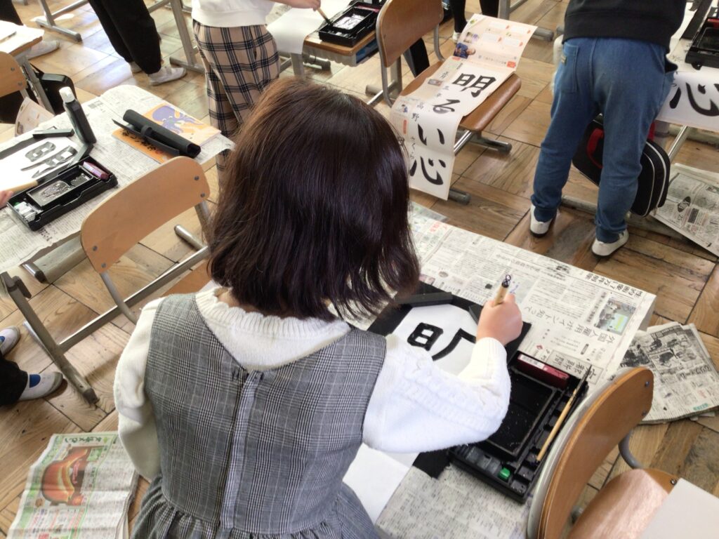 12月9日(火)3年生が書き初めの学習を行いました。講師は、たくさんの学年で習字や水墨画を教えていただき、毎朝子どもたちの登校を見守ってくださっている前坂さんです。今回書き初めで書く言葉は、「明るい心」です。習字道具の名前や使い方、字形を整えて書くポイントを分かりやすく教えていただきました。子どもたちは、緊張しながら丁寧に筆を運び、素敵な字を書いていました。