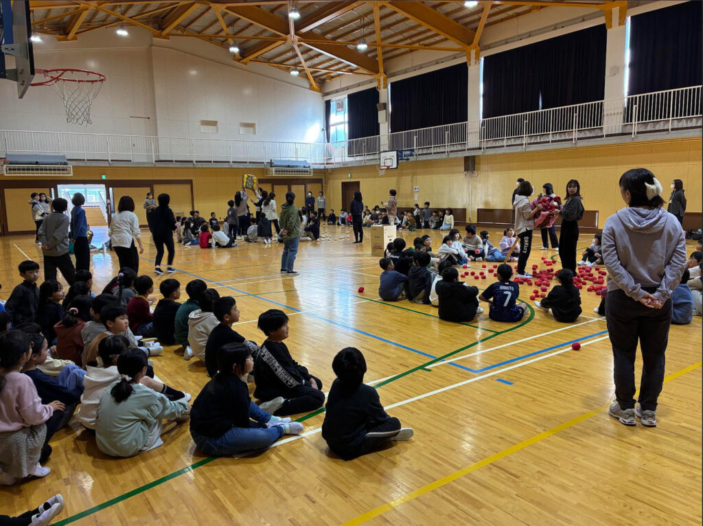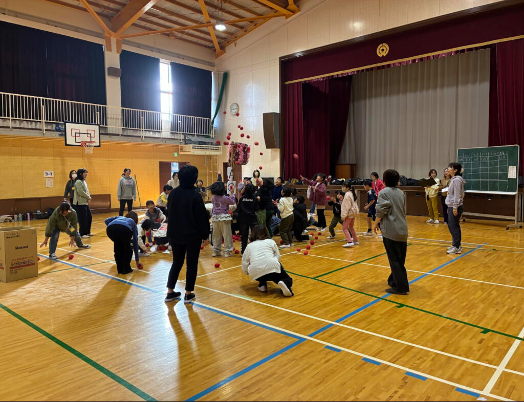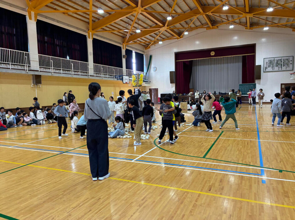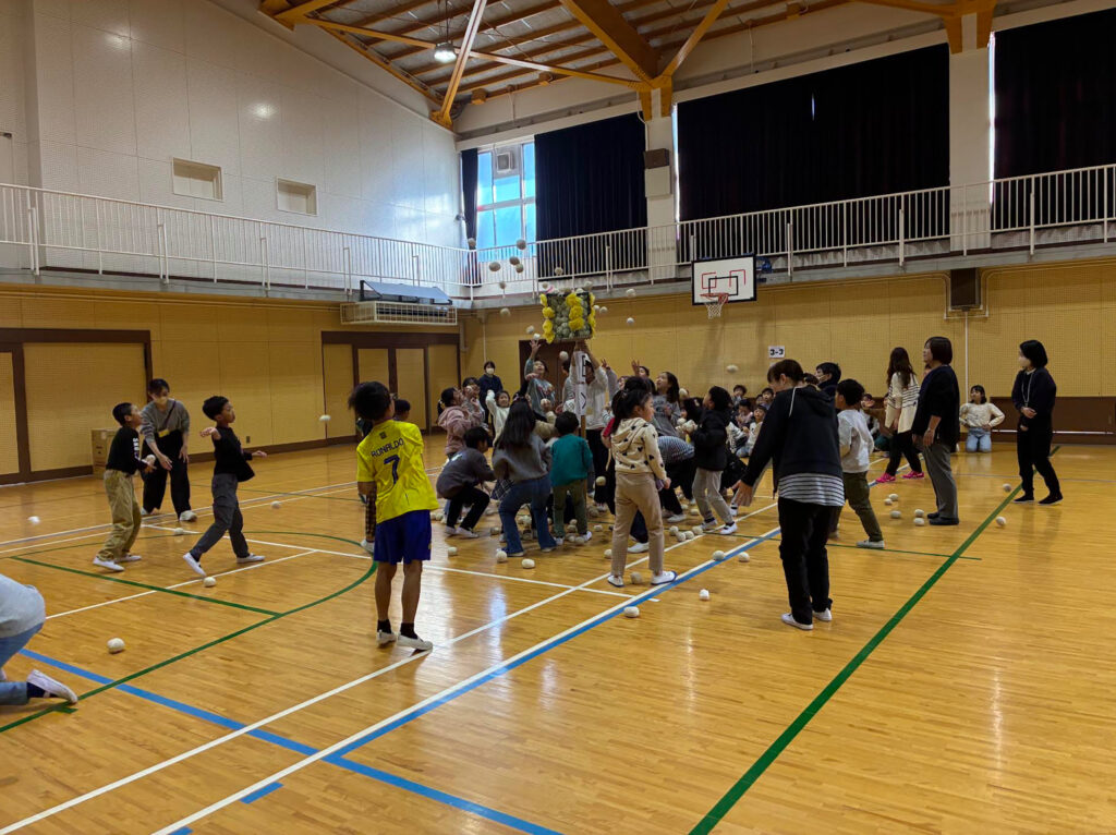 体育館に集まり、みんなで玉入れをしました。