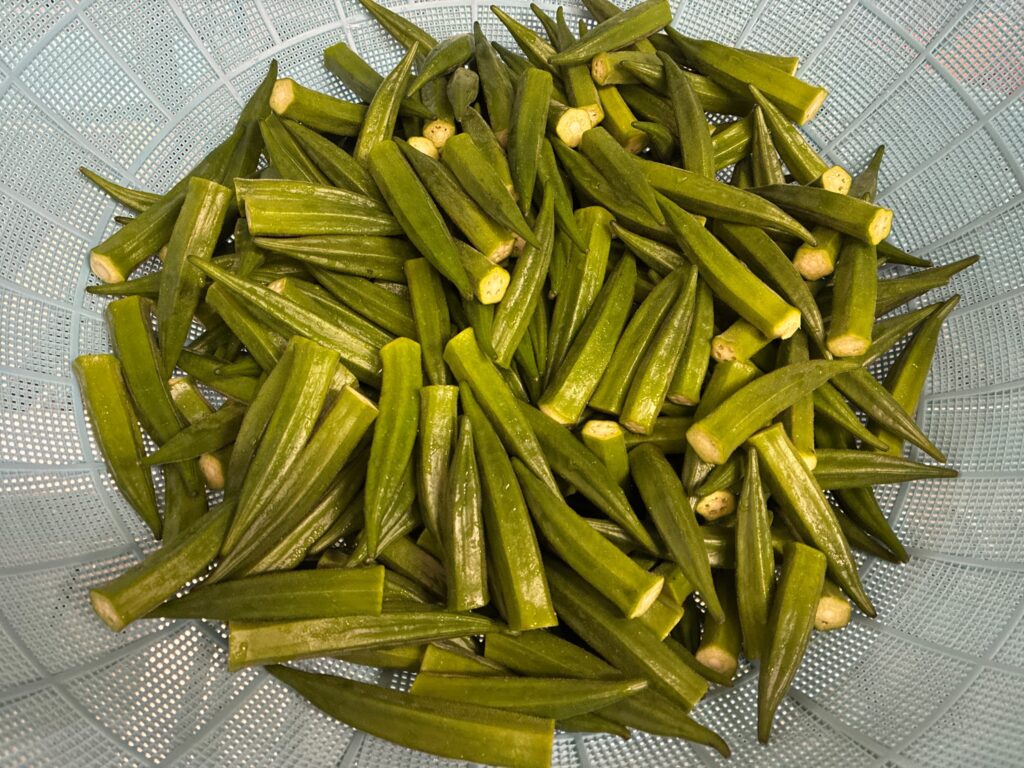 「ガンボ」とはオクラという意味で、今日は向日市の地元農家さんの新鮮なオクラを納品してもらいました。