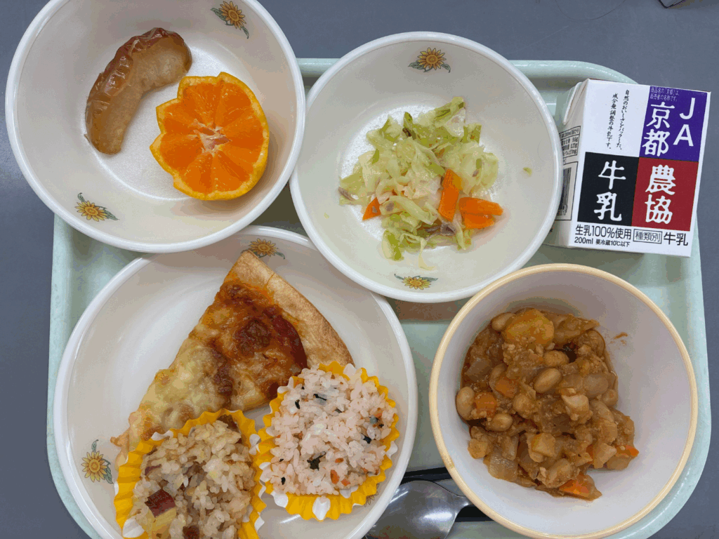 ミニバイキングのメニューは、主食のごはん【さつまいもとベーコンのピラフ、さけわかめごはん、ケチャップライス】から2つ、主食のピザ【ウインナーとじゃがいものトマトソースピザ、ツナとコーンのマヨみそ和風ピザ】から1つ、副菜の果物【黄桃、焼きりんご、みかん、パイナップル】から2つ、好きなものを選ぶことができます。