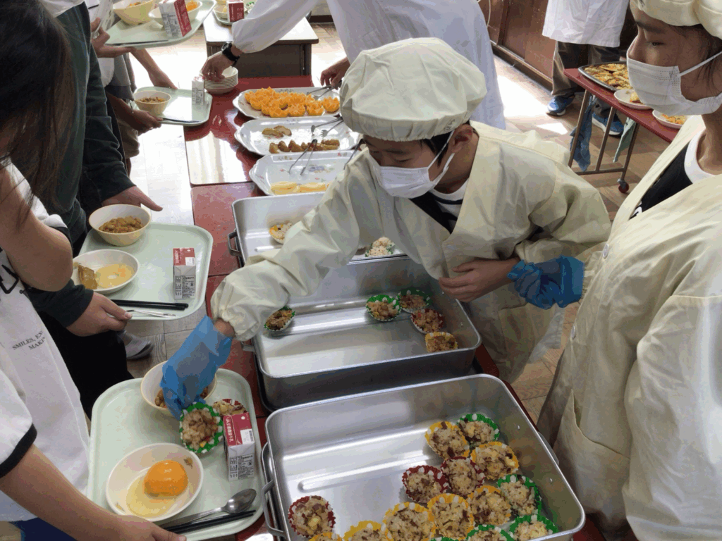 5年生は、バイキング給食前に、食べ物の3つの働きや、主食、主菜、副菜をそろえることで、栄養バランスの整った食事になることを学びました。