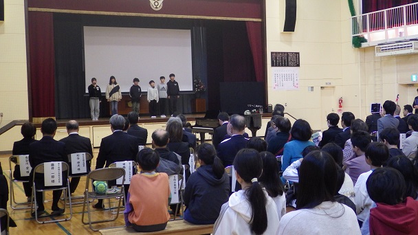多くの来賓の方の前で、児童会本部の6年生が5向小がこれまでの先輩方から大切に受け継がれてきたことや、これからも大切にしていきたいこと、自分たちの好きな5向小の場所などを伝えました。