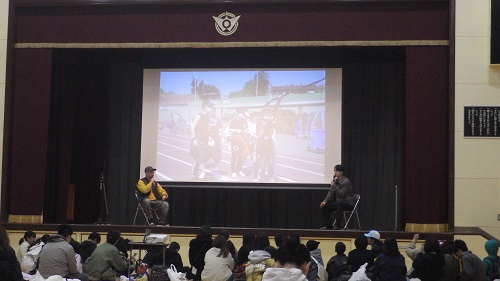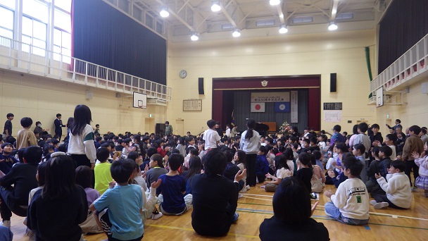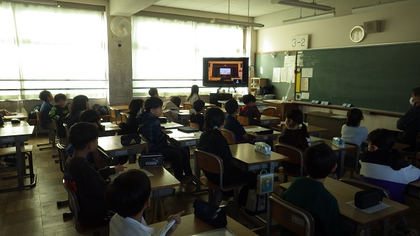 4~6年生は体育館で参加し、1~3年生はリモートで参加しました。