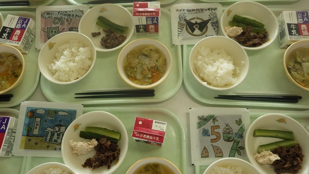 この日の給食は、50周年お祝いメニューの手巻き寿司でした。