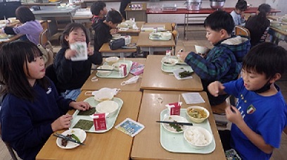 海苔は、全校の応募から決まった子ども達のオリジナルデザインでした。かわいいデザインの海苔に、そーっと袋を開けて、大事に持ち帰る子もいました。