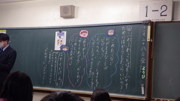 1年生は、「ふわふわことばをふやすには?」ちくちく言葉になりそうなときに、どんな言い方をしたらふわふわ言葉になるかを考えました。