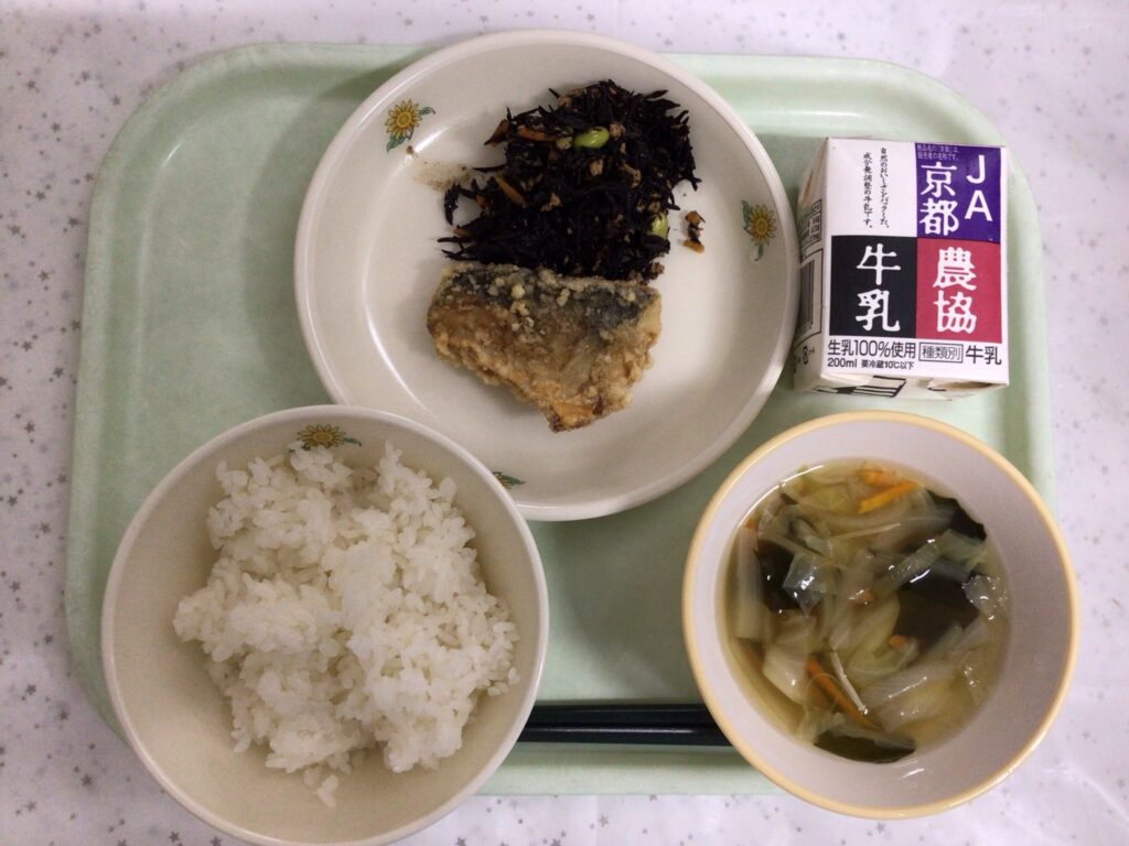 今日の給食でも、削り節で出汁をとった野菜のすまし汁と、ごはん、さばの竜田揚げ、ひじきのそぼろ煮の和食を味わいました。