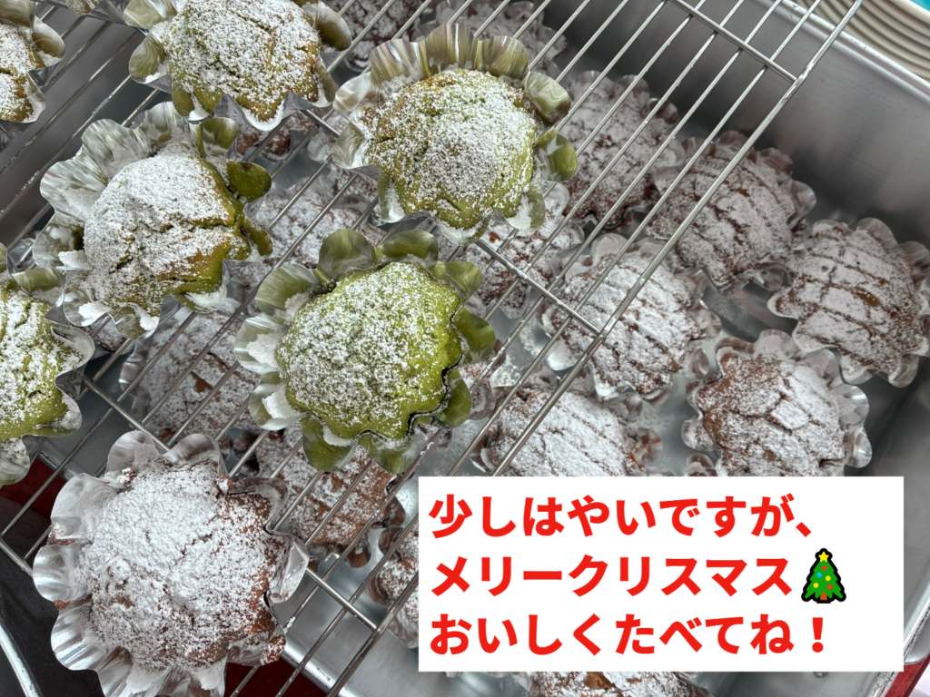 焼きあがった手作りカップケーキには、粉糖をふりかけ、クリスマスらしい仕上がりになりました。