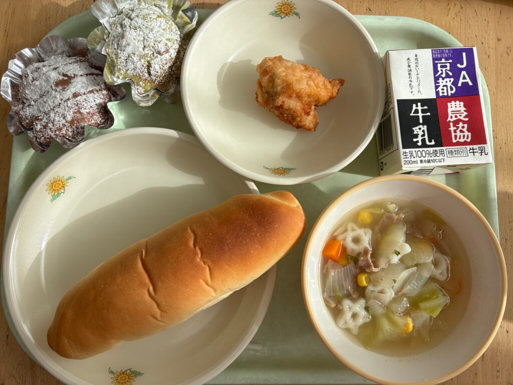 16日は小型パン・牛乳・フライドチキン・きらきらスープ(星型米粉マカロニ入り)・セレクトカップケーキ(ココア・抹茶)でした。