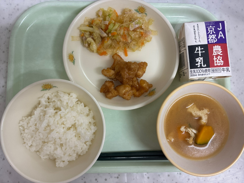 給食でも、5向小のみんなの健康を願い、「なんきん」(かぼちゃ)のみそしる、「かんてん」「にんじん」のサラダ、ゆず湯にちなみ、鶏肉のゆず香り揚げをつくりました。