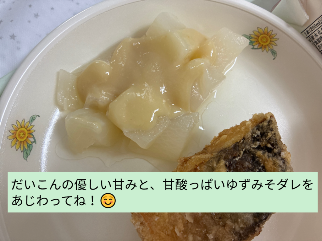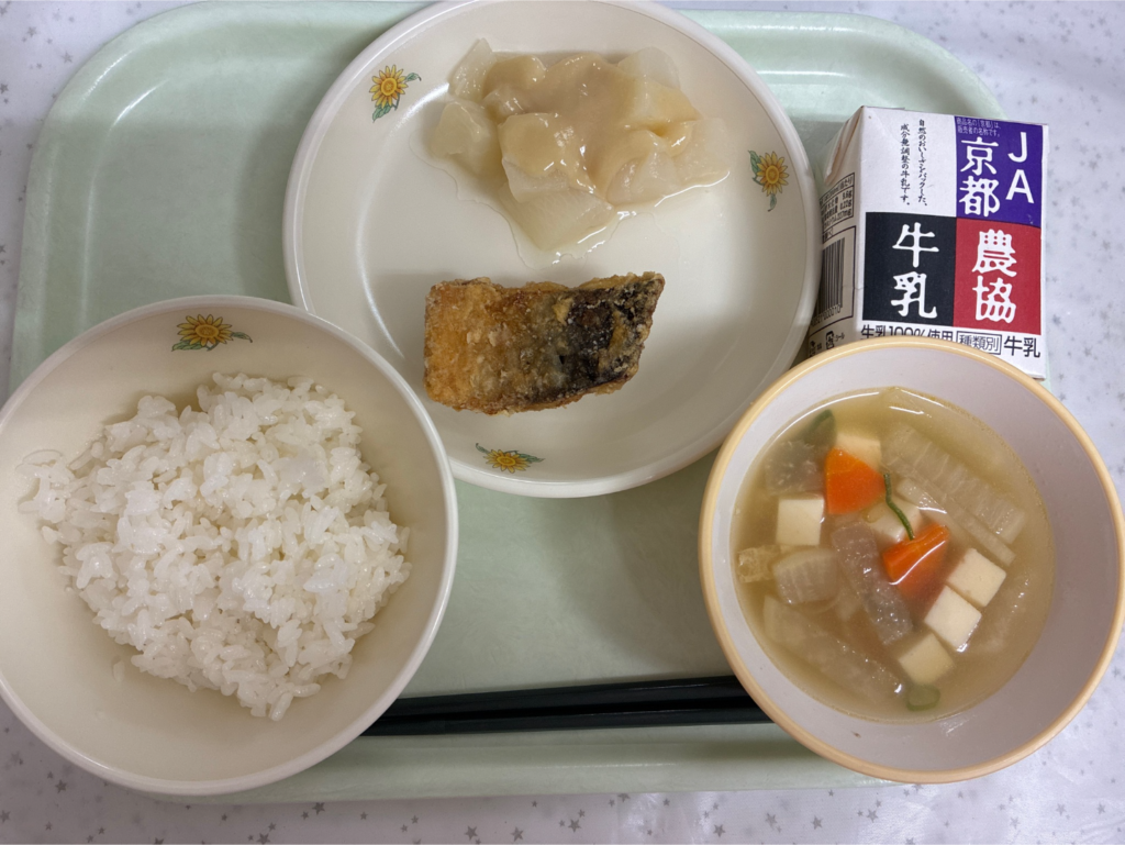 21日(水)の献立は、ごはん、牛乳、ゆうすげ村のふろふき大根、サバの竜田揚げ、けんちん汁でした。