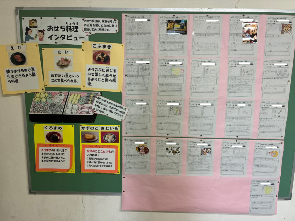 学校の掲示板には、冬休みに食べたおせち料理を紹介しています。おいしそうなおせちを家族で囲んだ様子が伝わってきました。