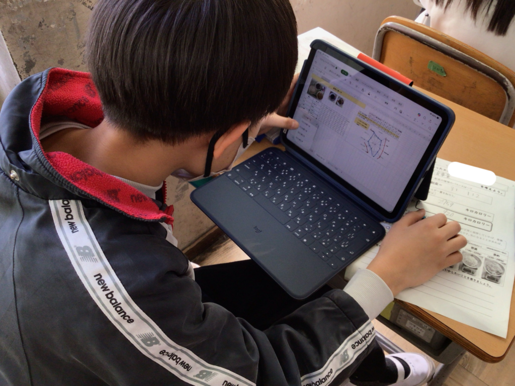 授業後の振り返りでは、「体格や生活にあった食事量やカロリーを知れて、最低これくらいは食べたいと思った、周りと比べず、自分にあった量を食べられるよう、中学校でも調整していきたい。」や「体重が増えたとき、食事量を減らさなきゃ、と思ったけど、自分に合った量を食べれば良いとわかりました。」「給食であまりおかわりしていなかったけど、自分がとらないといけないカロリーが高くて驚きました。これから積極的におかわりをしていきます。」など、自分自身の食事量について考えられていました。