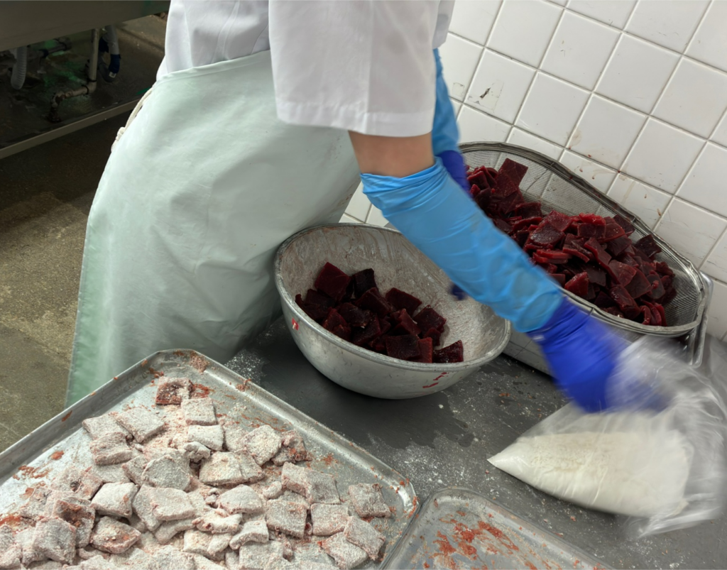 また今日は6年生のリクエストメニューのおかずの「くじらの甘酢ソースがけ」を作りました。