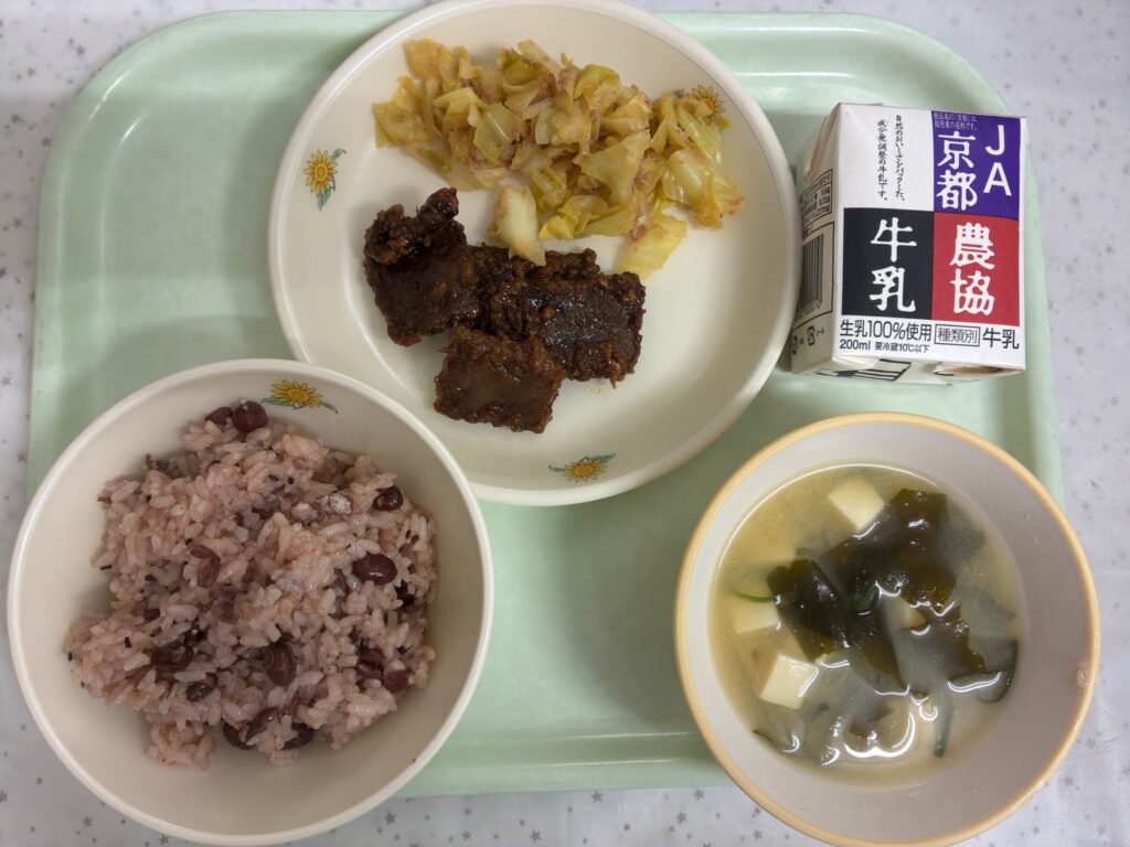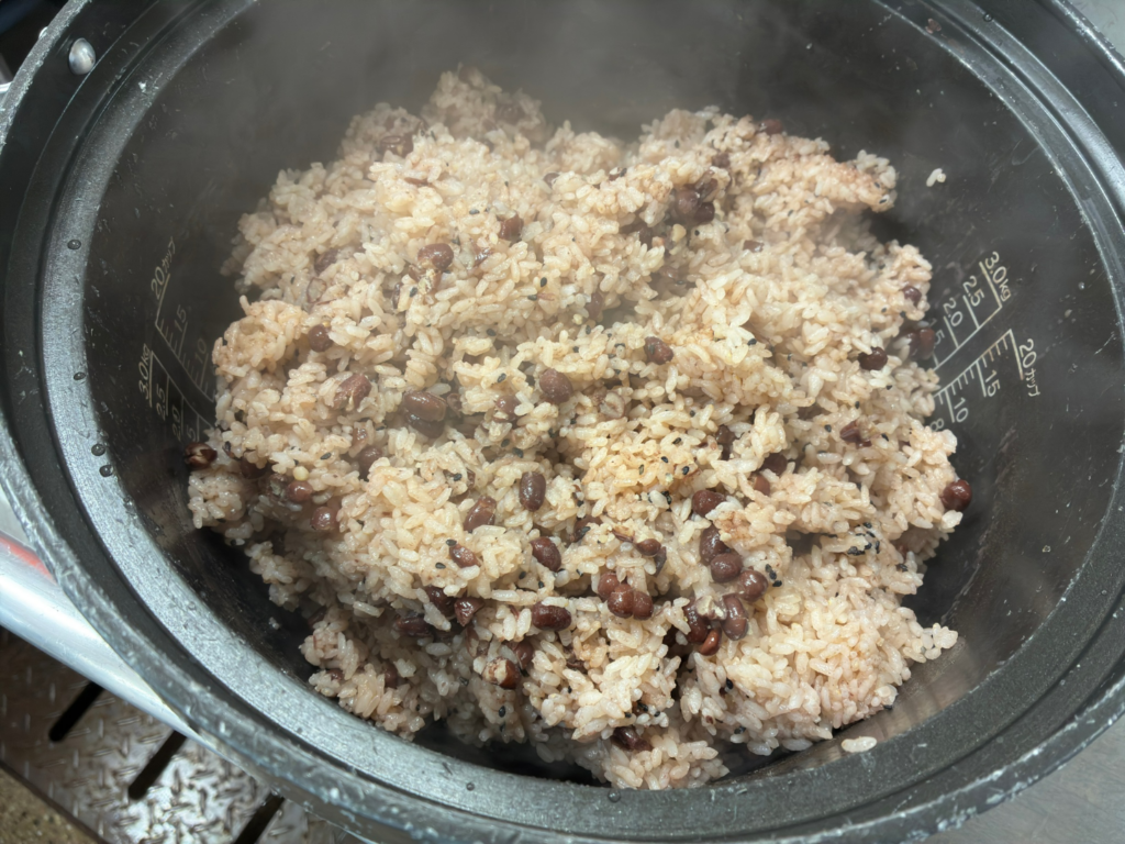 お赤飯は苦手という児童もいますが、日本の食文化に親しみながら、給食室で心をこめて手作りしたお赤飯を食べ、お祝いの気持ちを味わってもらえると嬉しく思います。
