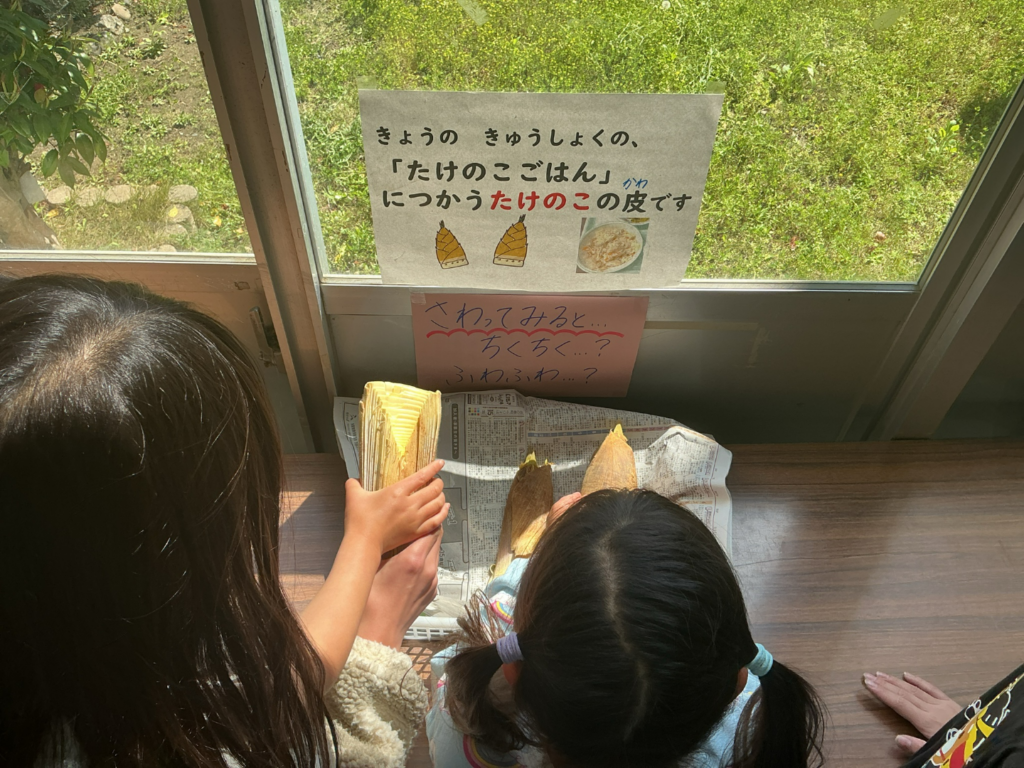 皮を展示すると、ふわふわした毛をやさしくなでる子や、皮の重なりに注目する子、けっこう皮はかたいなぁ・・・とつぶやく子など、五感でたけのこを感じていました。
