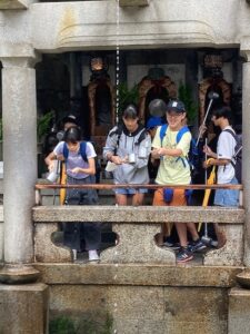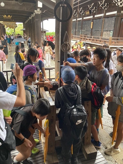 金閣寺は比較的空いていましたが、清水寺では多くの観光客で大変混雑しており、歩くのも困難な状況でした。そのような中でも、金棒や清水の舞台、音羽の滝を体験し、歴史や文化に触れることができました。昼食にはカレーをいただき、食後には買い物を楽しむなど充実した時間となりました。