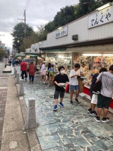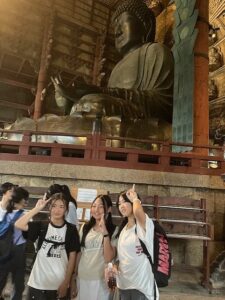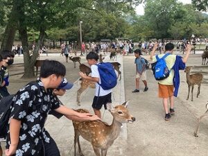 大仏の大きさに圧倒され、鹿の多さにも驚いていました。はじめは「かわいい」と言っていましたが、実際に鹿せんべいをあげるときには少し怖がる様子も見られました。その後、奈良町でお土産を買い、行程は時間通り順調に進んでいます。