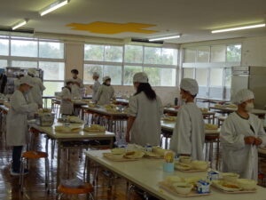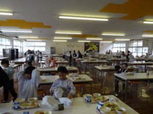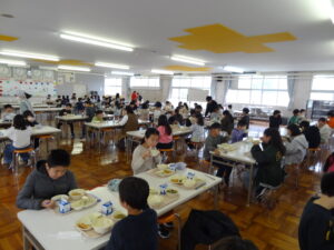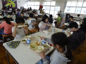 学校の様子子ども達の大好きな給食。給食当番がテキパキと準備を進め、ほぼ時間通りに全員そろって「いただきます!!」ができました。