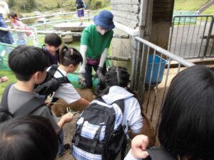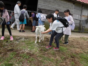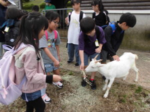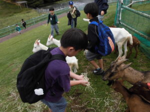 話を聞いた後は、ヤギに近づいてみたり草をやったりして楽しくふれあいました。