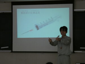 そこで、碇高原牧場の獣医さんに会い、獣医の仕事についていろいろ教えてもらいました。