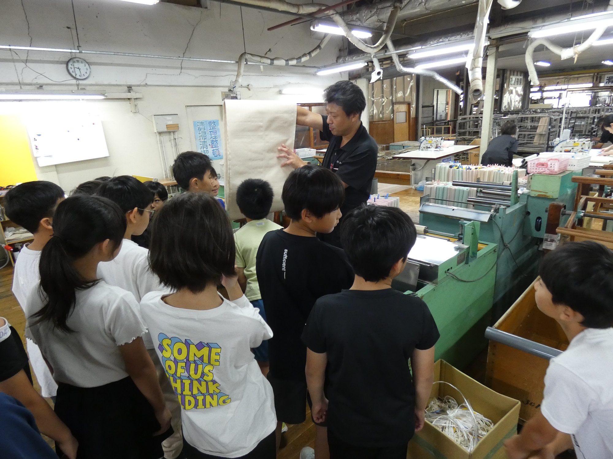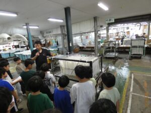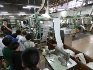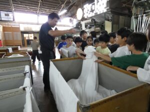 この加工場で「精錬」「乾燥」「幅出し」「検査」などがされている様子を見せてもらい、工場の方からくわしく説明を聞きました。