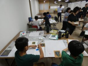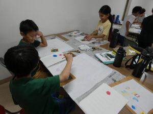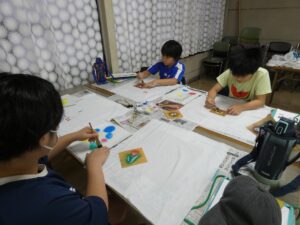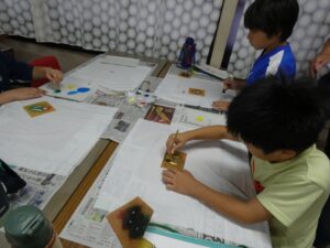 ストーリー性、連続性、好きなもの大集合 など、思い思いに図柄を考えて染め、最後はすてきなちりめんハンカチが完成しました。
