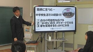 中学校の入学説明会を桃映中学校の池田先生をお招きして実施しました。中学校での生活、高等学校への進学に向けた話など、4月からの学校生活に向けてお話をいただきました。「勉強は大切」と改めて考えた6年生でした。