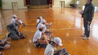 6年の体育はバスケットボールです。バスケットボールを何時間するか、どんなことを学ぶのかなどをみんなで共有し、投げ方などを学びます。ただ単に楽しく球技をするのではなく、チームとしてどのようなことをしていくのかを学びます。