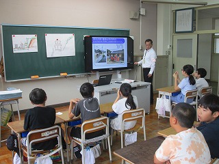 5年生では災害を防ぐようにするにはどうすればよいか考える学習をしています。この日は京都府砂防ボランティア協会の下釜様、藤田様をお招きして、砂防教室を開きました。土砂崩れや洪水の様子を写真や動画で見せてくださり、とてもわかりやすく学ぶことができました。