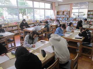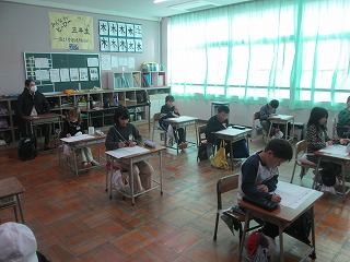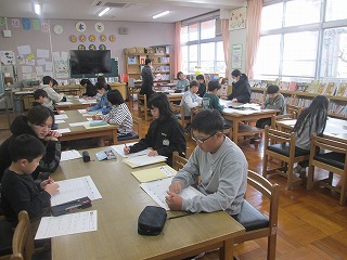 昨年度から続けている異学年のこつこつタイム。学級閉鎖の関係でクラスで行うこともありますが、週1回1時間学習をしています。静かに集中して、みんなプリントに向き合っています。かっこいいです!福知山公立大学の学生の方も採点を手伝ってくれています。
