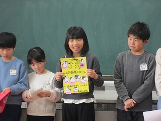 給食感謝集会がありました。お箸の持ち方や食事のマナーの話を聞いた後、用務員さんをはじめ、給食に携わっている方々への感謝の手紙を披露し、渡しました。「いただきます」「ごちそうさま」にたくさんの気持ちを込めて、今日もモリモリ給食を食べましょう!