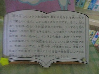 須蒲先生の10月のおすすめの本は「月のうさぎ」(前田 式子 文 司 修 絵)です。この本はインドの月のうさぎの話です。月がまるくなる十五夜に、お客が来たら自分の食べ物をわけてあげなくてはなりません。かわうそ、やまいぬ、さる、うさぎはそれぞれどうするのでしょうか。