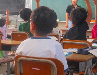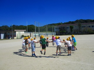 10月9日(木)の3時間目に1年生が運動場で「天までとどけ、一、二、三」と教科書にのっている「くじらぐも」のように、大きな声をだしてジャンプをしました。