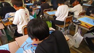 1月29日(木)の6時間目に4年生が版画をしました。板にかいた自分の顔を彫刻刀で彫りました。力の加減をしながら、丁寧に彫っていきました。