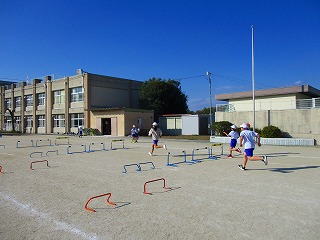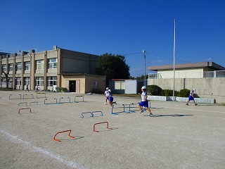11月21日(金)の5時間目に4年生が運動場でハードル走をしました。一定の間隔で並べたハードルを一定のリズムで走り超えられるように練習しました。
