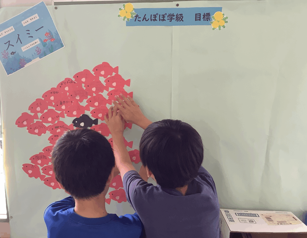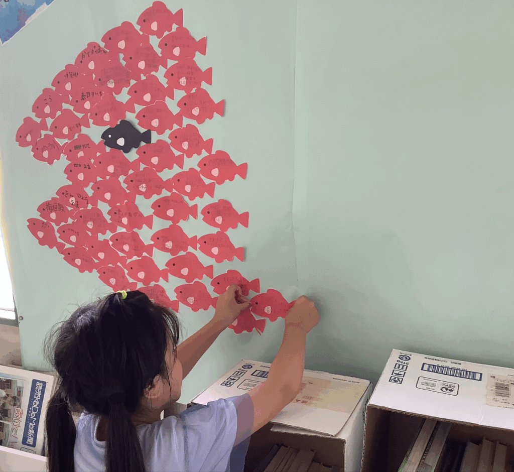 2学期が始まり、1か月が過ぎました。たんぽぽ学級では、学級目標をもとに9月の振り返りをしました。学習や運動会の練習を頑張った9月を振り返り、自分のがんばりを赤い魚に書いて貼りました。みんなの頑張りで、赤い魚も大きくなってきています!