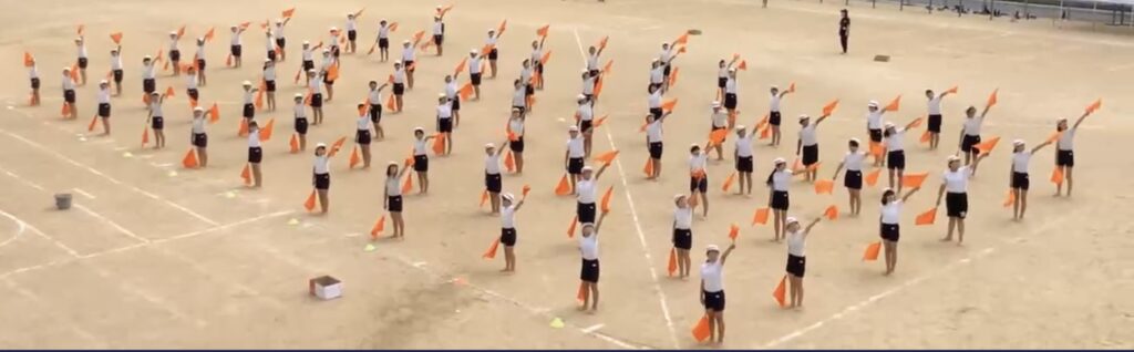 5年生は運動会当日に向けて、大運動場での練習を始めています。フラッグを使った表現では、タイミングを合わせ動きをそろえることを頑張っています。バシッと音を立てて止まる瞬間やウェーブが見どころです。
