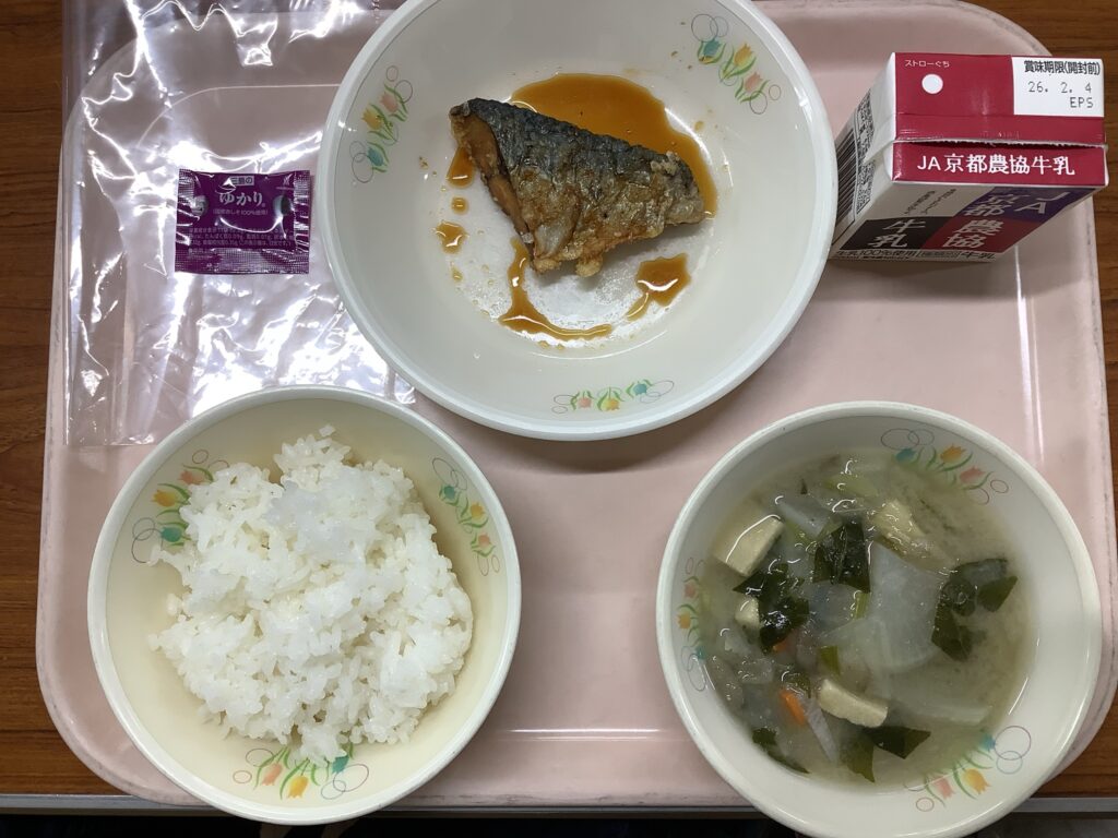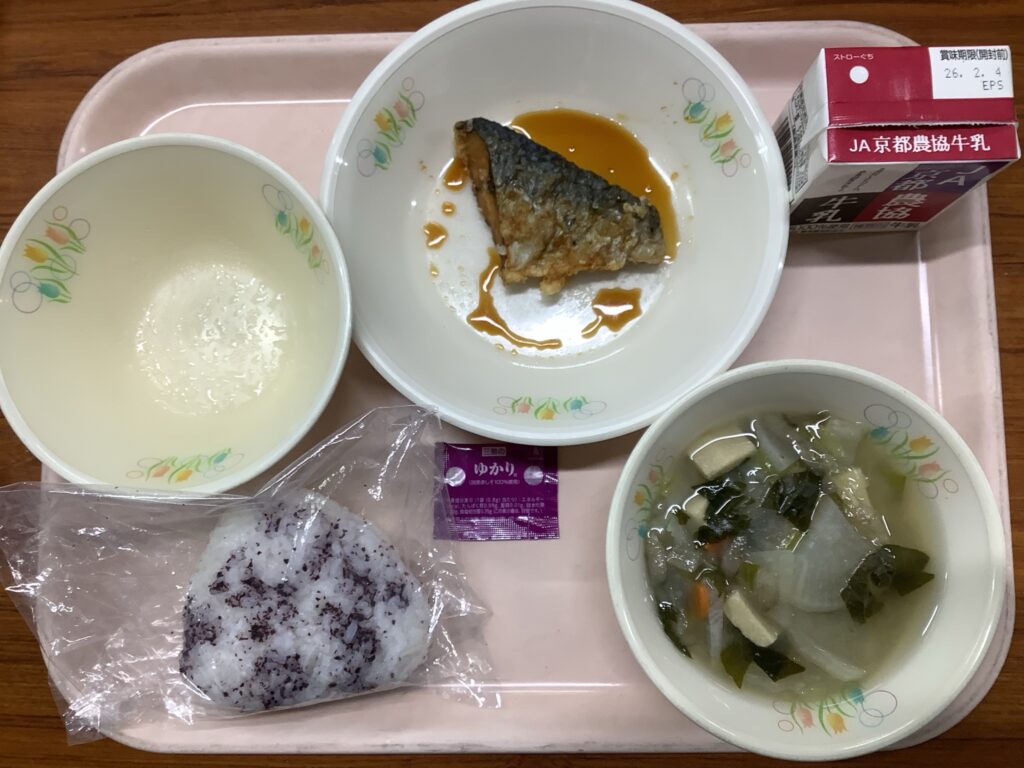 本日の献立は、セルフおにぎり、魚のかば焼き、炊き出し風みそ汁でした。