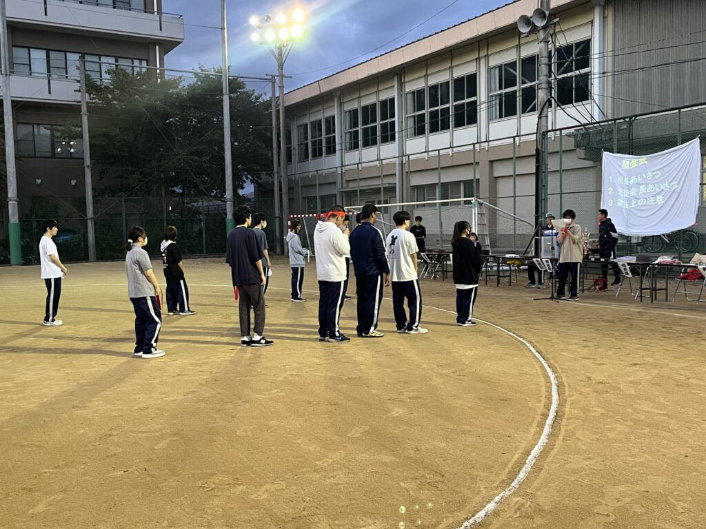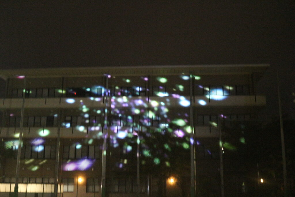 雨が降る天気予報でしたが、無事に体育祭を実施することができました。前半は大縄跳び、満水リレー、借り物競走を行い、休憩時間中には、近畿職業能力開発大学校にご提供いただき、プロジェクションマッピングを投影していただきました。後半は玉入れ、全員リレーと競技を行うことができて、各競技で白熱した戦いを繰り広げました。