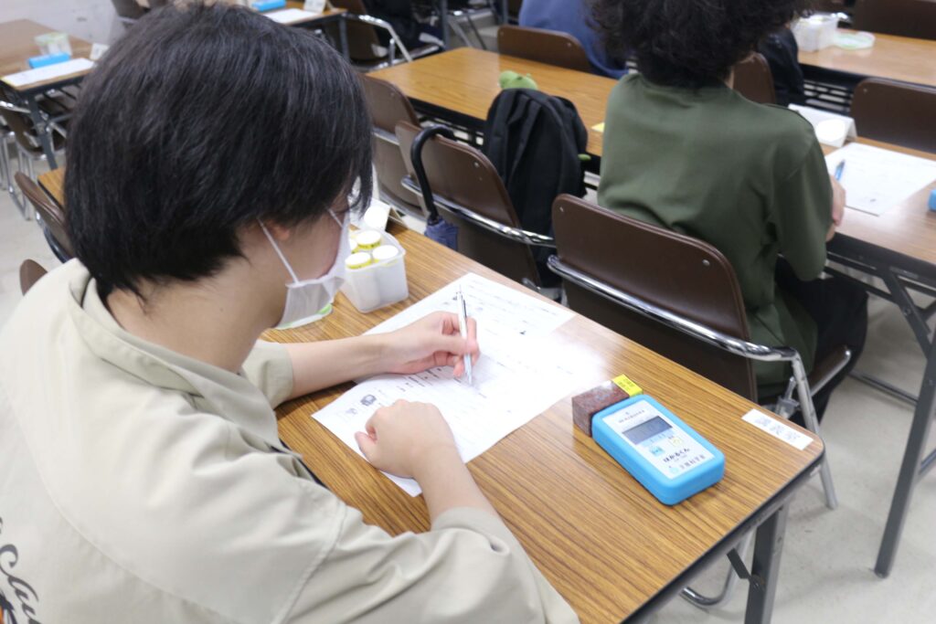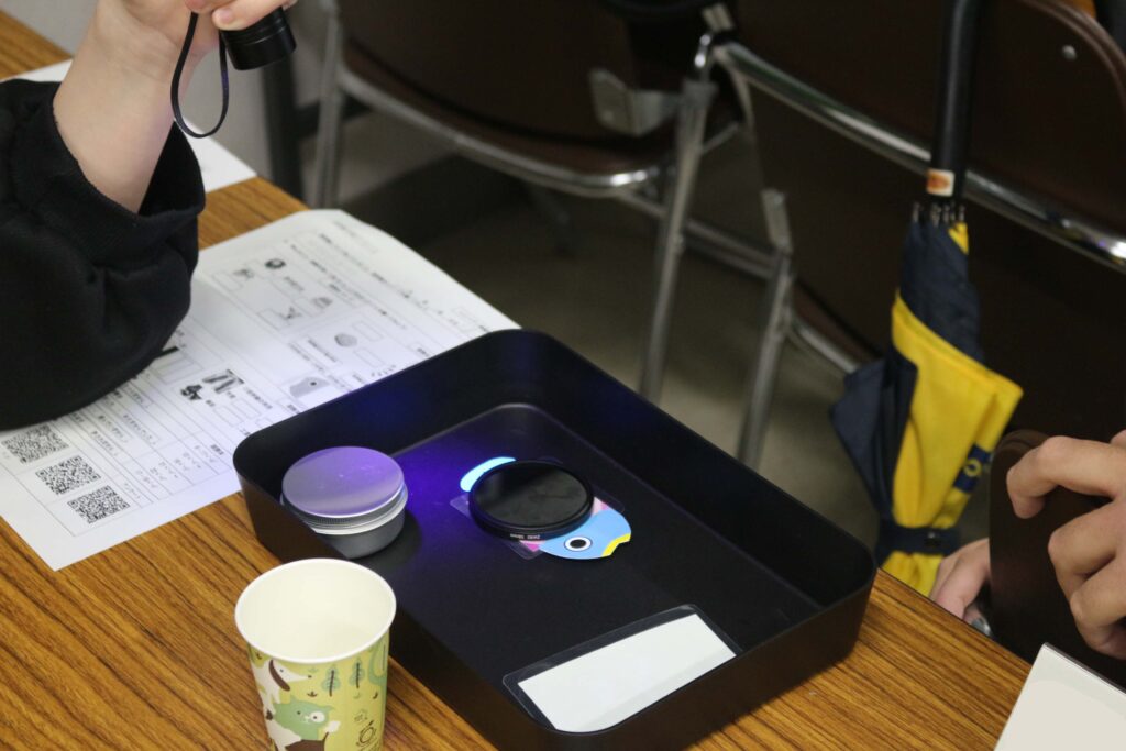 また、ブラック・ライト(紫外線)を感光紙に当て、レントゲン模擬実験も行いました。生徒が放射線に関する科学的な知識を身につけ、理解を深めることができました。