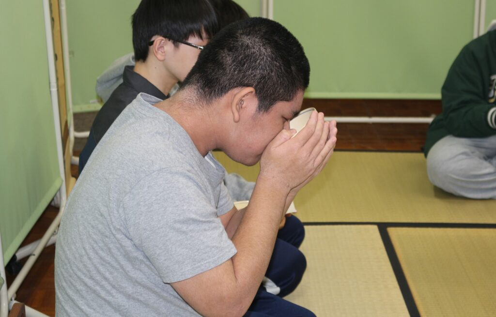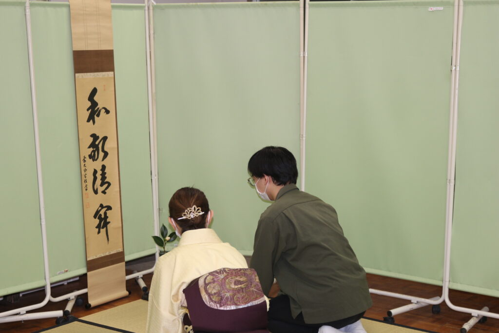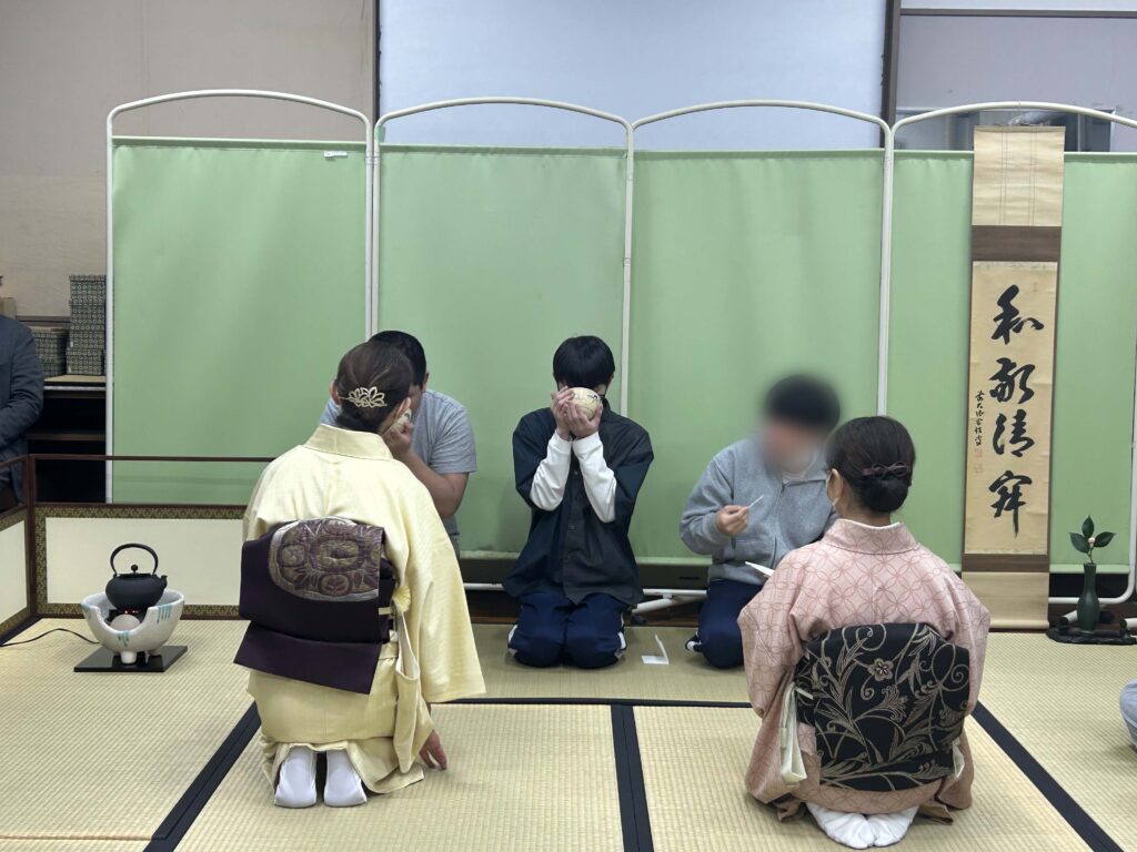 事前学習では、作法や茶道具の名前や使い方、茶道の精神などを学び、30日に実践を行いました。体験の初めは、慣れない作法や正座に苦戦していました。しかし、講師の方々から作法について丁寧に詳しく教わっていく中で、最後までやりきることができました。講師の先生から振る舞われたお茶やお菓子を美味しくいただきつつ、茶道の心得『和敬清寂』を学ぶことができました。