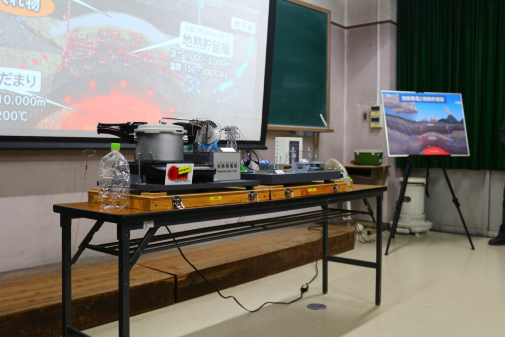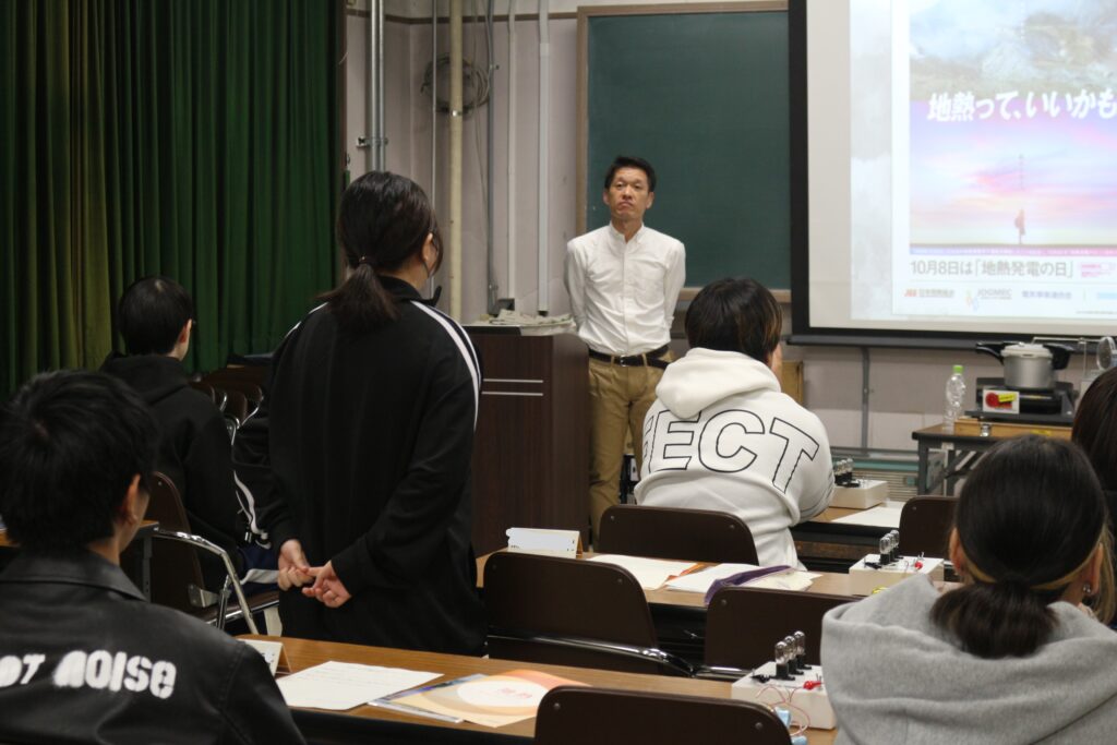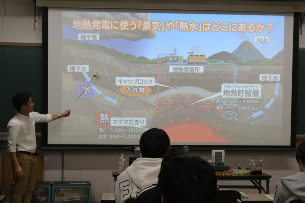 令和7年11月17日、本校では理科特別授業として「地球の熱で電気をつくる!地熱発電」をテーマに学びました。講師にはJOGMEC(石油天然ガス・金属鉱物資源機構)の飯野貢次郎様をはじめ、専門家の方々をお招きし、日本に豊富に存在する地熱資源や、その活用方法について詳しく教えていただきました。