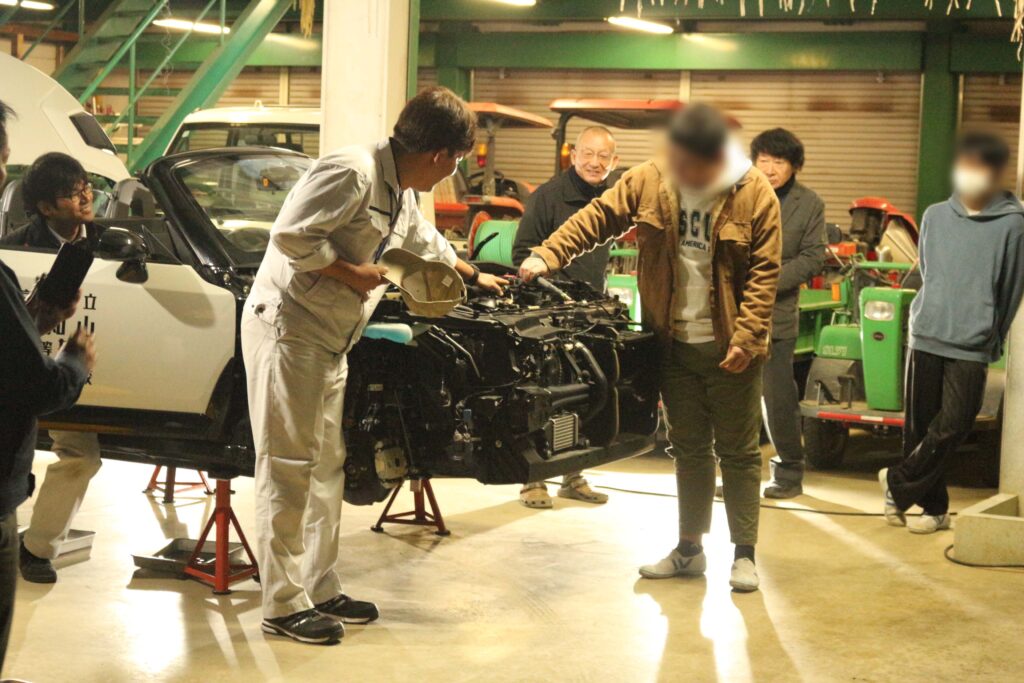 福知山高等技術専門校からコペンという車を持ってきていただき、その場で解体されたコペンを実際に生徒が組み立てるということにチャレンジしました。生徒たちは、講師に教えていただきながら、様々な部品を取り付け、車を組み立てることができました。