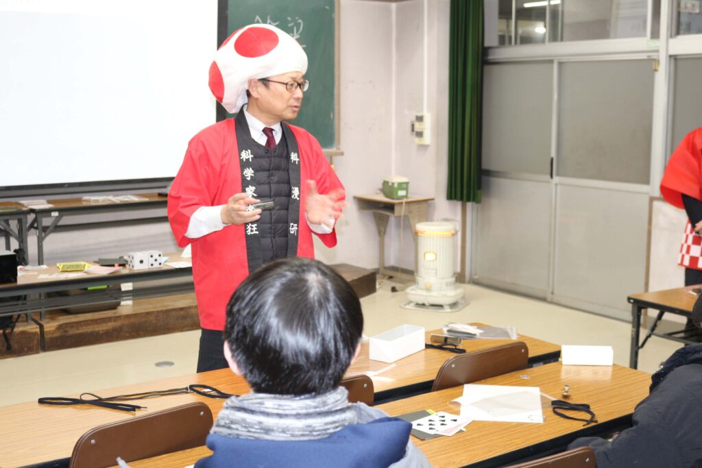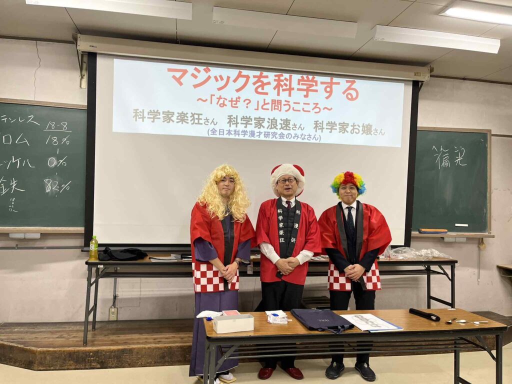 令和8年1月26日(月)に『マジックを科学する ~「なぜ?」と問うこころ~』というテーマで、講師に全日本科学漫才研究会 科学家楽狂(村田 直之 氏)をお招きして、理科特別授業を行いました。 またアシスタントとして、当日のみの臨時会員の科学家浪速氏、科学家お嬢氏にも参加していただきました。