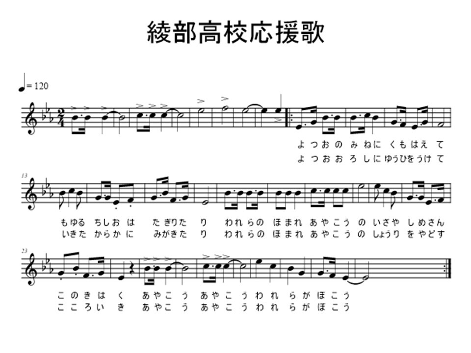 PTA PTA保護者応援歌教師綾部綾部高校綾高 【PTA広報委員より】綾部高校応援歌 PTA Twitter Facebook はてブ Pocket LINE コピー 2025.10.08 現在、PTA広報委員は「綾部高校応援歌復活プロジェクト」という活動をしています。その活動で綾部高校応援歌の主旋律がわかりましたので、曲にしてみました。お聴き下さい。 Post Views: 27